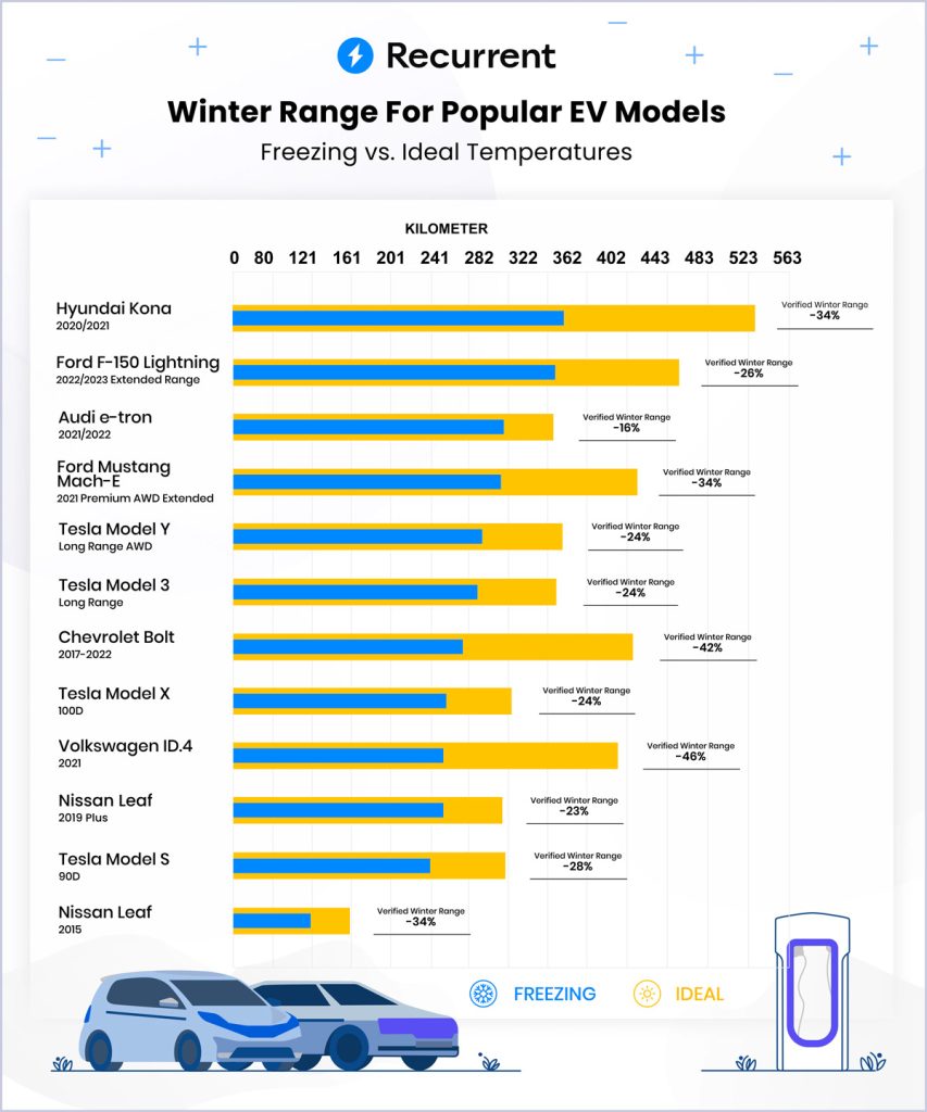 Data gathered from 18,000 electric cars shows how much range is lost in the cold